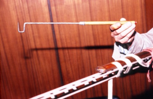 Hier noch einmal die Führungstechnik. Der Führungsstab wird in den Rücken eingehängt. Zwei Stäbe kontrollieren die Hände und somit die Arme der Figur. Kopf und Leib bestehen aus Gips. Das hierdurch erreichte Gewicht der Figur machte ihre horizontale Führung erst möglich. In den Rücken des Leibes wurde eine Metallplatte mit einer vertikalen Röhre eingearbeitet. In diese fest verankerte Röhre wurde von unten der Führungs- und Haltehaken des horizontalen Führungsstabes eingeschoben. Eine horizontale Drehung des Führungsstabes bewirkte somit eine vertikale Drehung (oder sanfte Neigung) der geamten Figur. Genial.